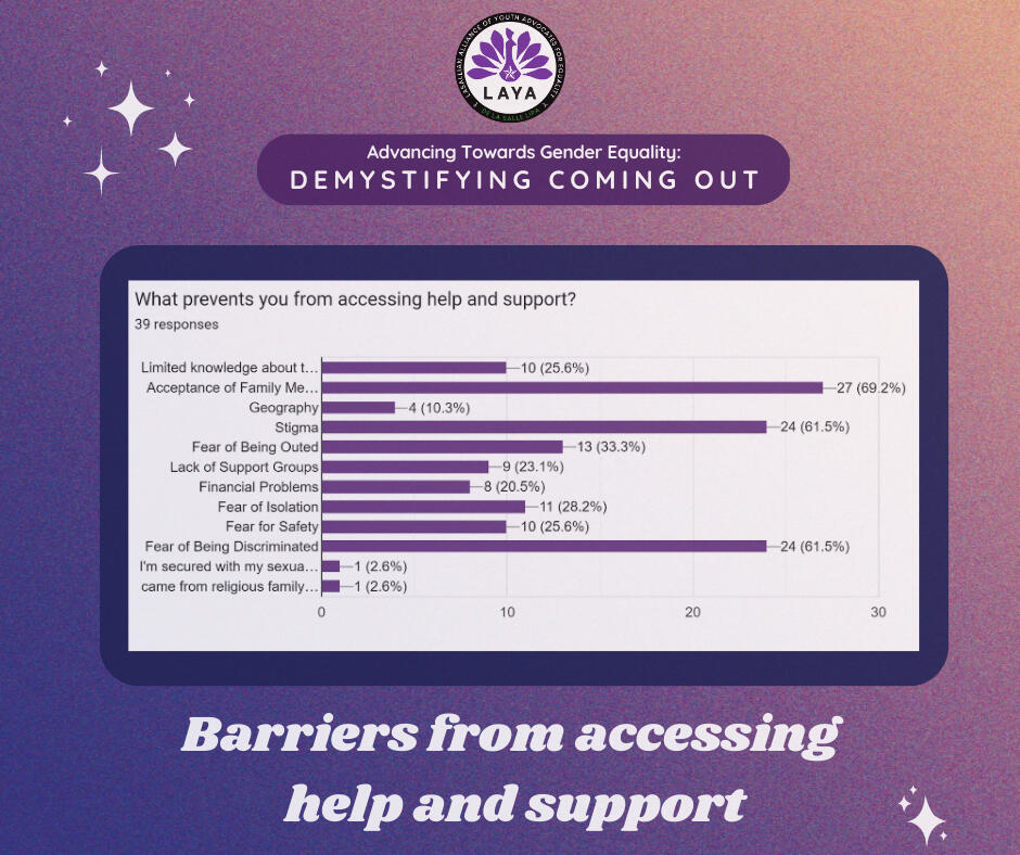 According to the results from the survey, only 2.6% of the respondents are fully out, which is then supported by the numbers that say the acceptance of family members, stigma and the fear of discrimination are the main barriers to members of the LGBTQ+ community in accessing help and support.From this, we can derive that even though the times are fast changing, the deep-rooted beliefs and practices of the community are hard to break or even bend. Members of the LGBTQ+ community, whether part of the Lasallian Community, lack representation and needs our help in achieving equality. Members of the Lasallian College Community have recommended that the institution, De La Salle Lipa and its stakeholders continue implementing activities that would establish an inclusive community and a safe space for everyone.