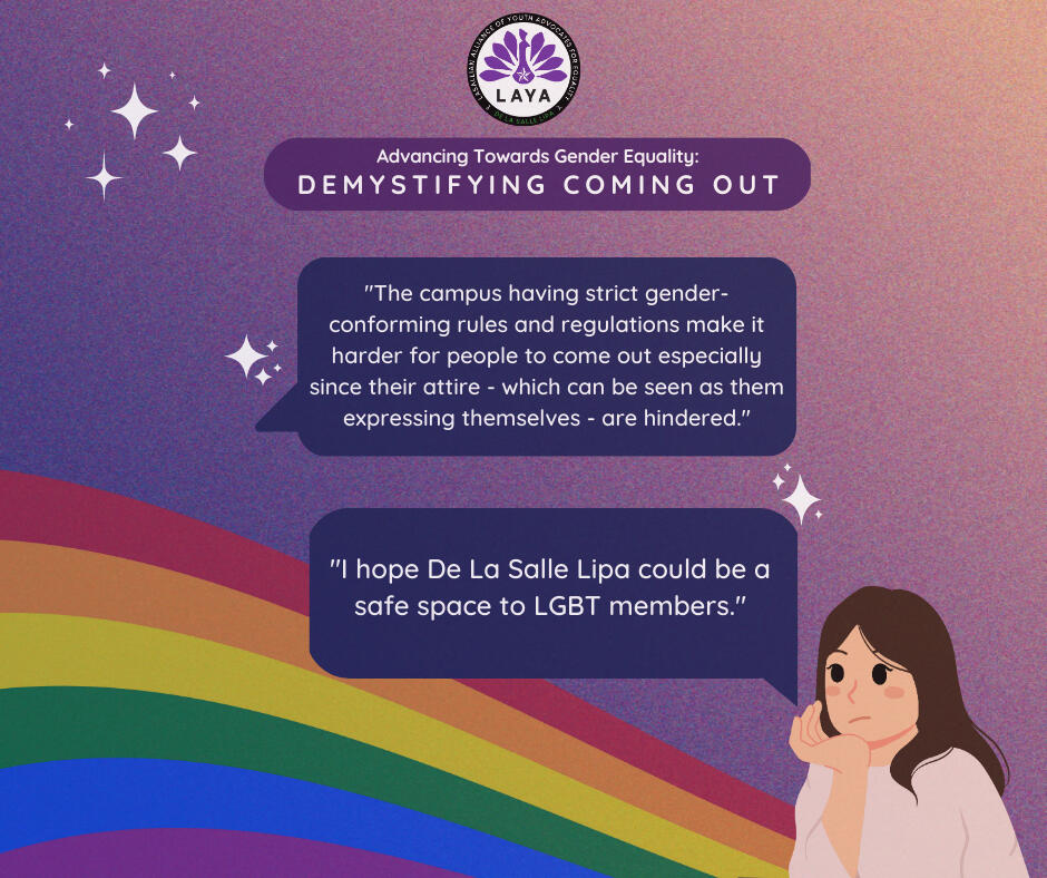 This annual campaign of LAYA that aims to involve members of the Lasallian Community in establishing a more inclusive environment. For this year, its theme is “Demystifying Coming Out” which aims to inform the Lasallian Community about the process of coming out through online postings.Seventy-seven (77) respondents, all of which are members of the Lasallian College Community for this school year, became part of the campaign. A survey has been conducted to gather information and suggestions that may be used in formulating future projects and to engage the Lasallian Community in improving the service of delivering safe, equal, and inclusive spaces for all.